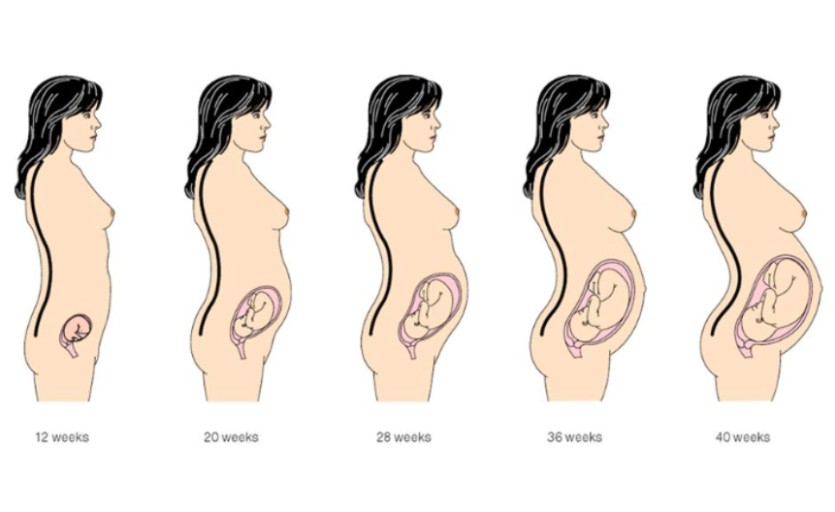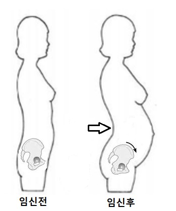 - 산모는 뱃속 아이가 성장함에 따라 산모의 전방으로 이동된 무게중심을 보상하고, 횡경막 아래쪽의 복벽을 넓혀 폐용량을 확보시키기 위해 골반의 전방경사가 증가한다.