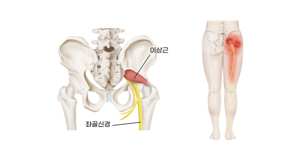 ❇️ 특히 이를 근골격계에서는 엉덩이 통증의 대표적 증후군인 이상근증후군이라고 하는데 이상근이 비대해짐으로 인해 좌골신경이 압박을 받아 엉덩이와 허벅지 뒤쪽, 때로는 종아리와 발까지 통증과 감각 이상이 나타난다.